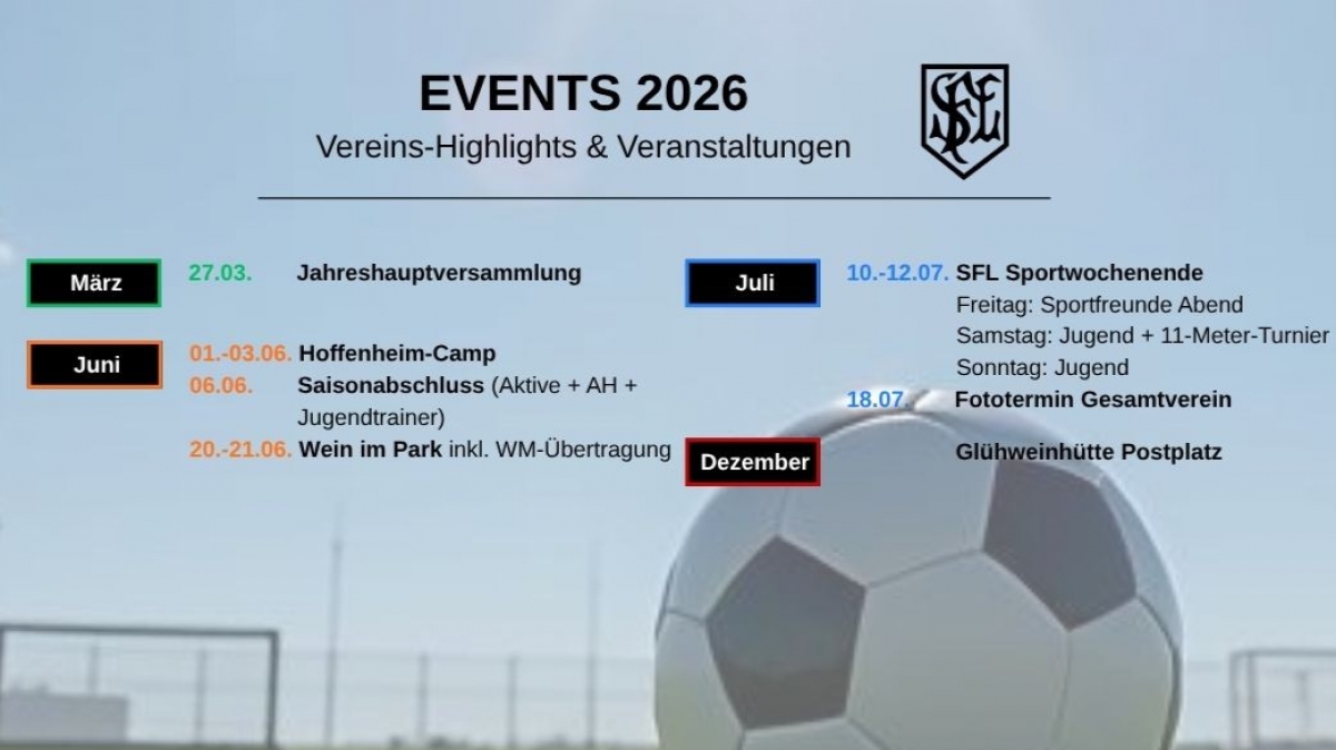 Die ersten Veranstaltung des Jahre 2026 stehen. Wir freuen uns u.a. auf das Pfingst Camp des TSG-Fussballschule, ein tolles Wochenende bei "Wein im Park" oder auch auf unser jährliches SFL Fußballwochenende im Juli. Seid dabei! Wir freuen uns.